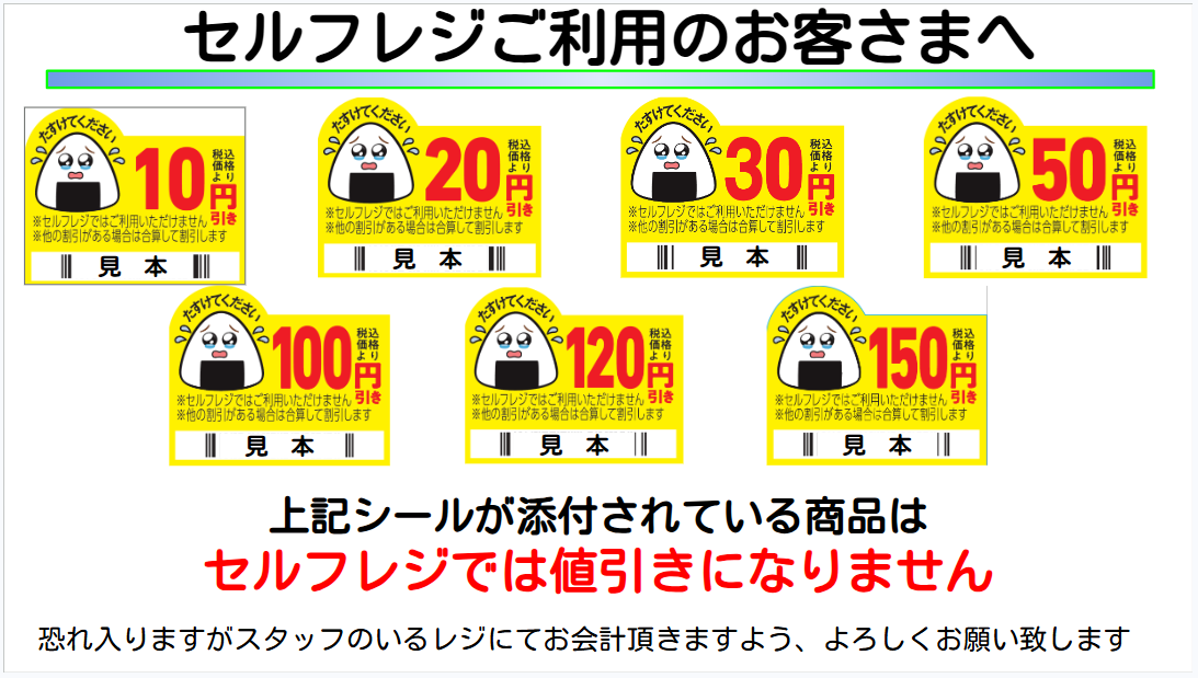 値下シール(涙目シール)のバーコードはセルフレジではご利用頂けません。